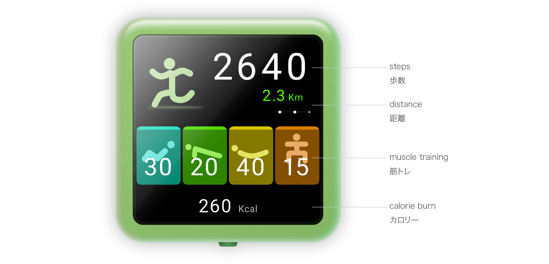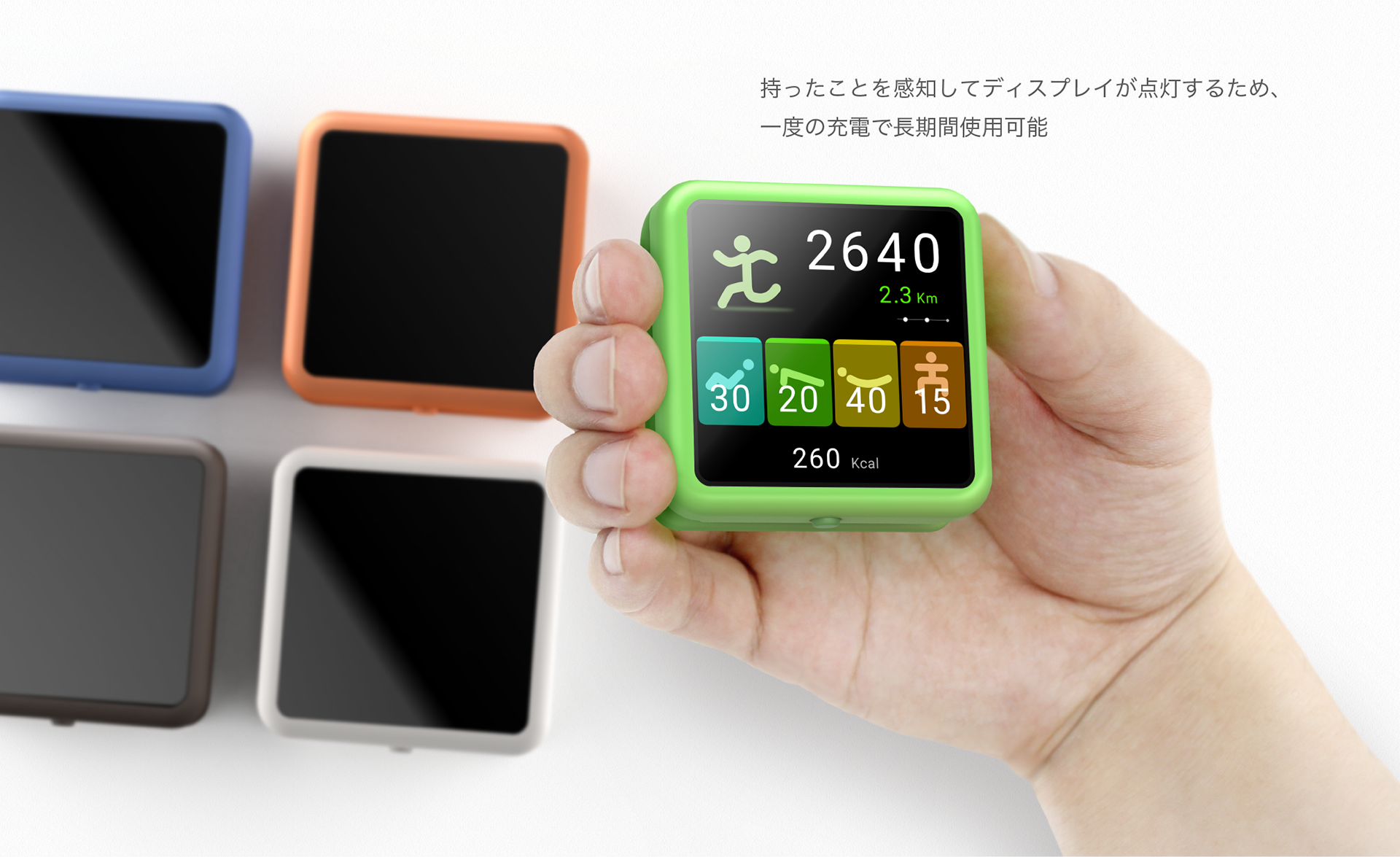 シンプル且つアクティブな操作で筋力トレーニングをサポートする、全く新しい歩数計のプロダクトデザインの提案です。